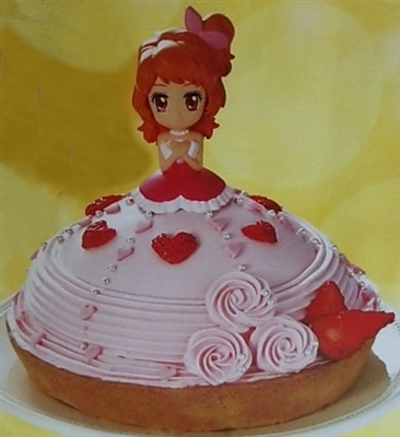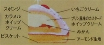 アイカツ! キラメキドリーミングケーキ 表面はいちごクリーム、土台はアーモンド生地のビスケットのケーキです。 トッピング:苺(2個)ハート型シュガークラフト、アラザン別添※飾り付けは自分たちでやる仕様です。 間:スポンジで囲うようにプリン風味のカスタードホイップクリーム、カラメルホイップクリーム、みかんが入っています。 ※上記の大きな画像も参照